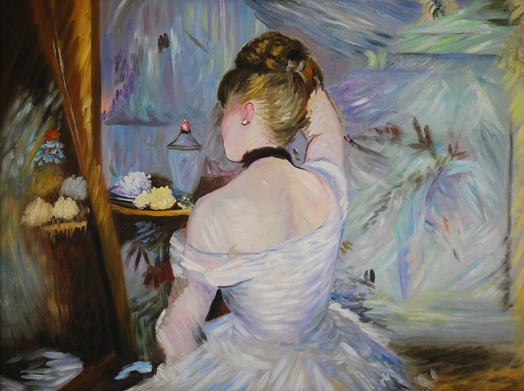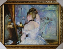 商品No:P-29 作者:モリゾ 作品名:化粧する若い女 キャンパスサイズ:60cm×80cm 販売価格:26,000円 |