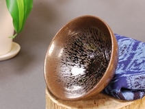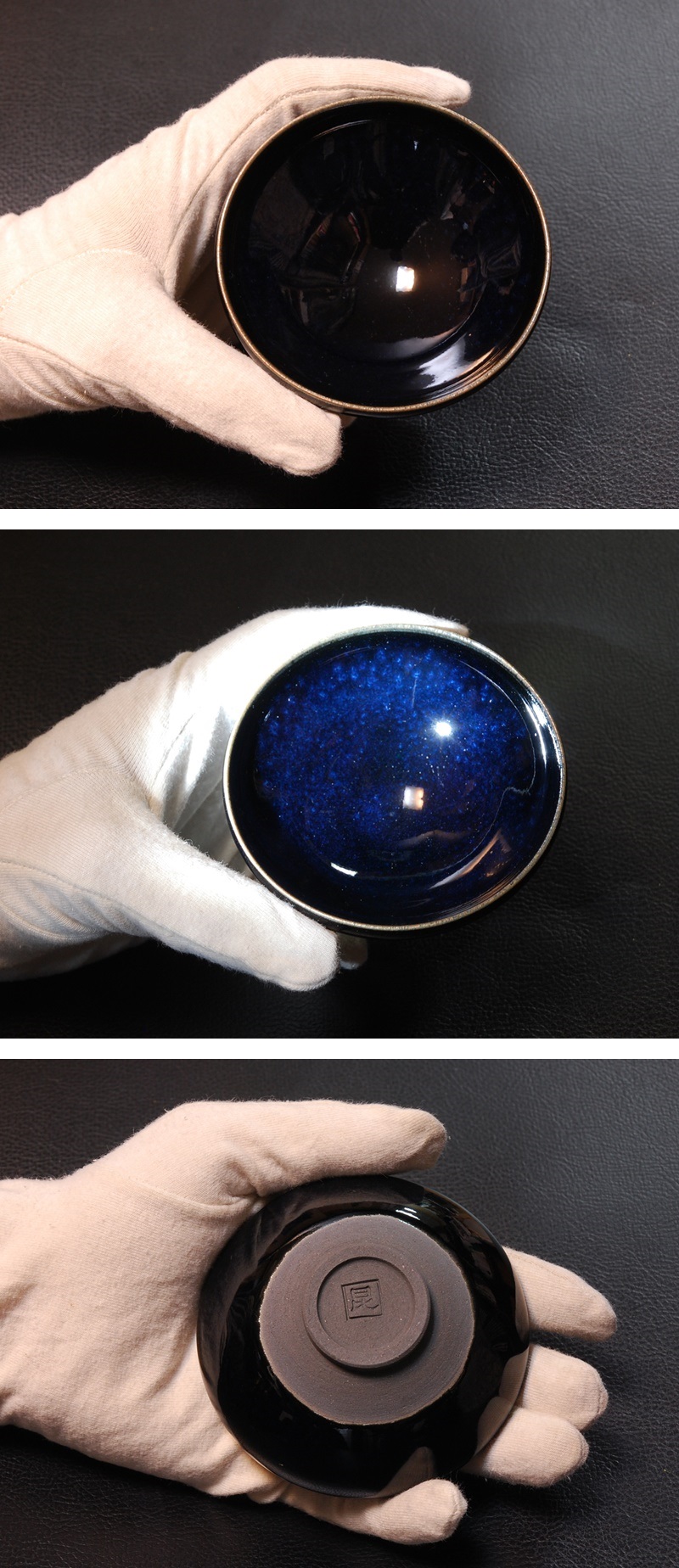 商品No:T-20 中国現代版油滴天目碗 サイズ:画像参照 価格:29,500円 中国福建省の建窯で昔からの技法を受け継いで薪窯で作られている油滴天目盃の現代版です。 |